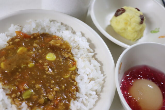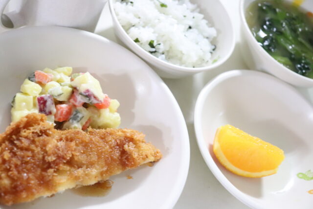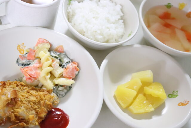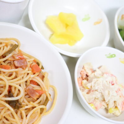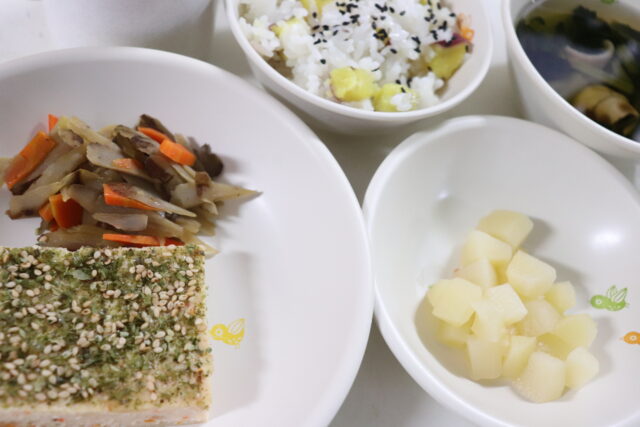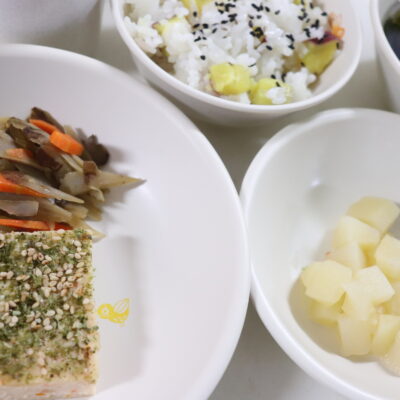 今日のお昼ご飯はなんだろう?今月のおすすめレシピは? 気になる毎日のおいしさと栄養をご紹介します。 都民の日 休園日・松風焼き・きんぴらごぼう・さつま芋ごはん・すまし汁・白桃・醤油ラーメン・春巻・白菜のお浸し・みかん・キーマカレー・さつま芋サラダ・お月見ゼリー・照焼ハンバーグ・じゃが芋のマヨ焼・ブロッコリーサラダ・ごはん・スープ・スパゲティナポリタン・れんコーンサラダ・スープ・パイン・麻婆豆腐・肉しゅうまい・もやしのナムル・ごはん・スープ・白身魚フライ・マセドアンサラダ・わかめごはん・味噌汁・オレンジスポーツの日 休園日・白身魚のコーンフレーク焼・マカロニサラダ・ごはん・スープ・パイン・肉汁うどん・かぼちゃの旨煮・スティック野菜・黄桃・鶏肉の味噌がらめ・キャベツの磯和え・ごはん・すまし汁・バナナ 10月